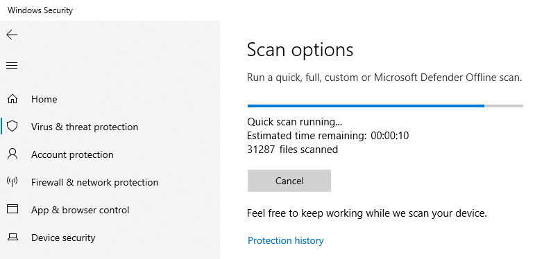 To run a scan manually, either go to Settings > Update & Security > Windows Security or type security in the Start Menu search bar and select the Best Match. Select Virus & threat protection and click Quick scan.