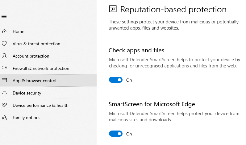 To ensure these tools are offering maximum protection, select App & browser control in Windows Security. Click Turn on under Reputation-based protection if prompted, then click Reputation-based protection settings.