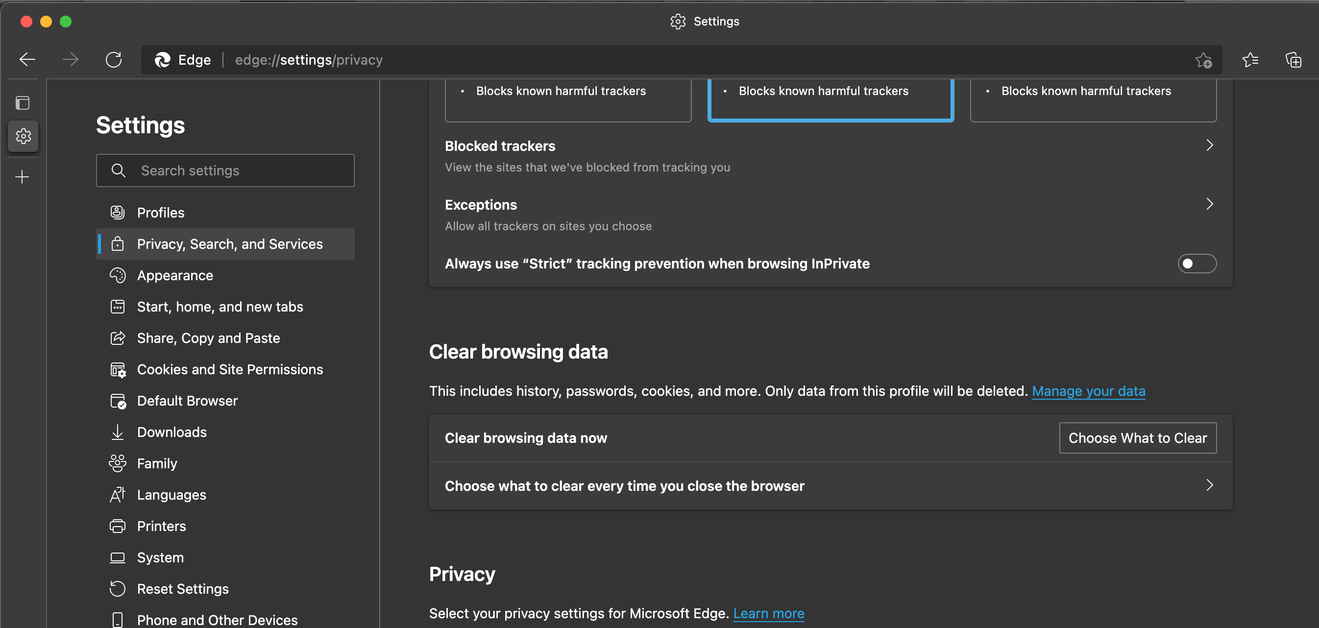 To do the clearing open Edge’s Settings by clicking on the three dot menu and selecting it there, or by using the keyboard shortcut Cmd + Comma.