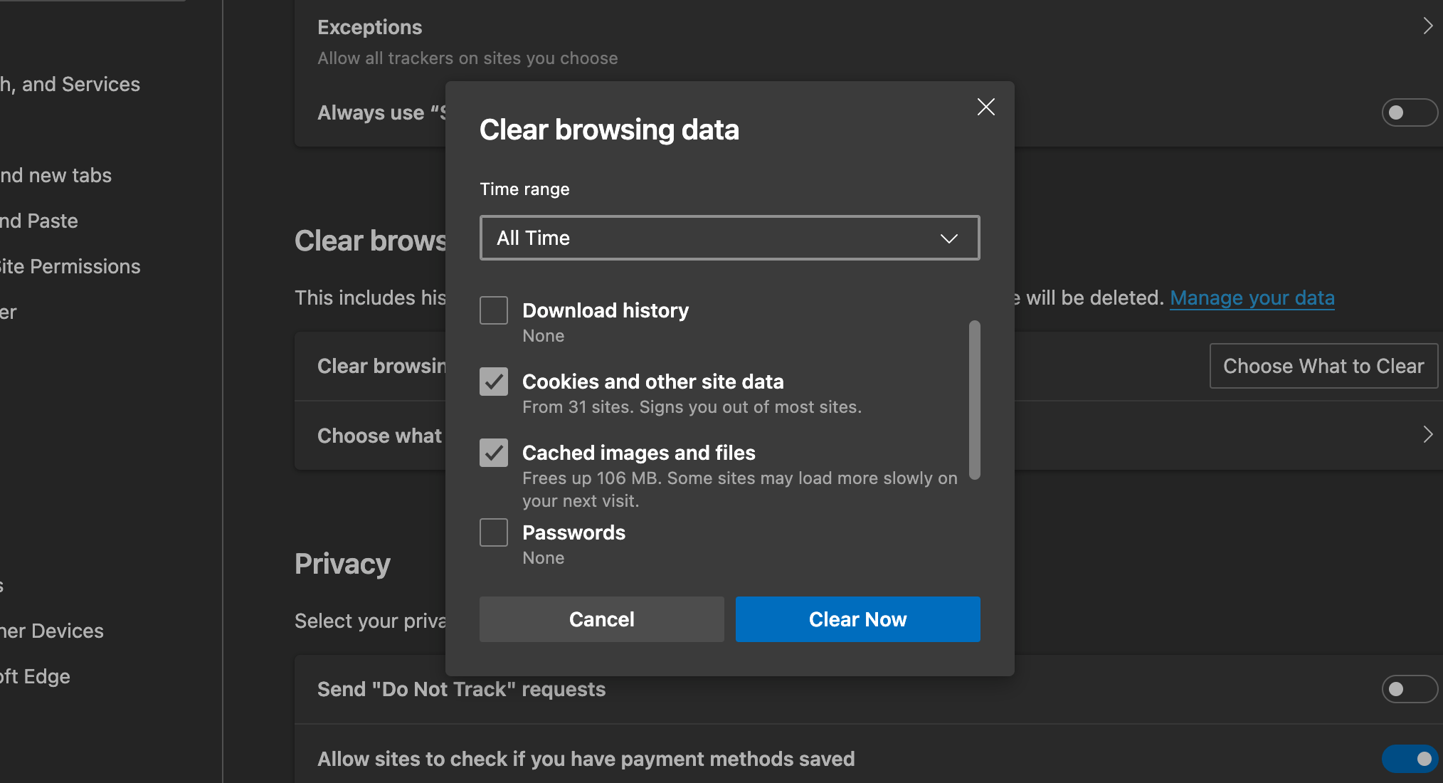 Click the Clear Now button. Your caches and cookies in Edge will now be cleared away!