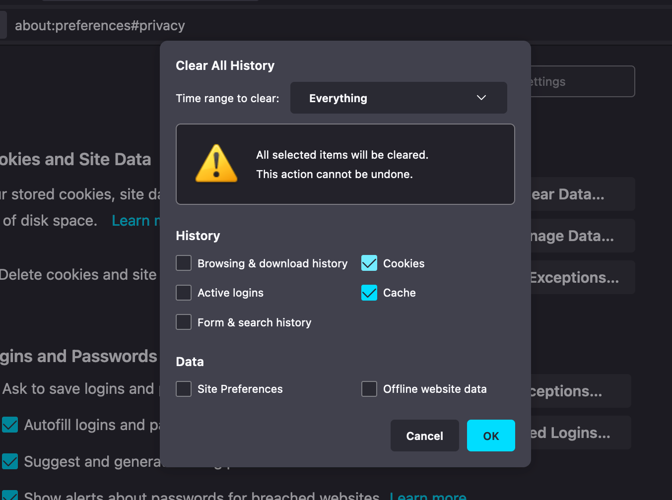 Hit the OK button. Your caches and cookies will be cleared out this way too!