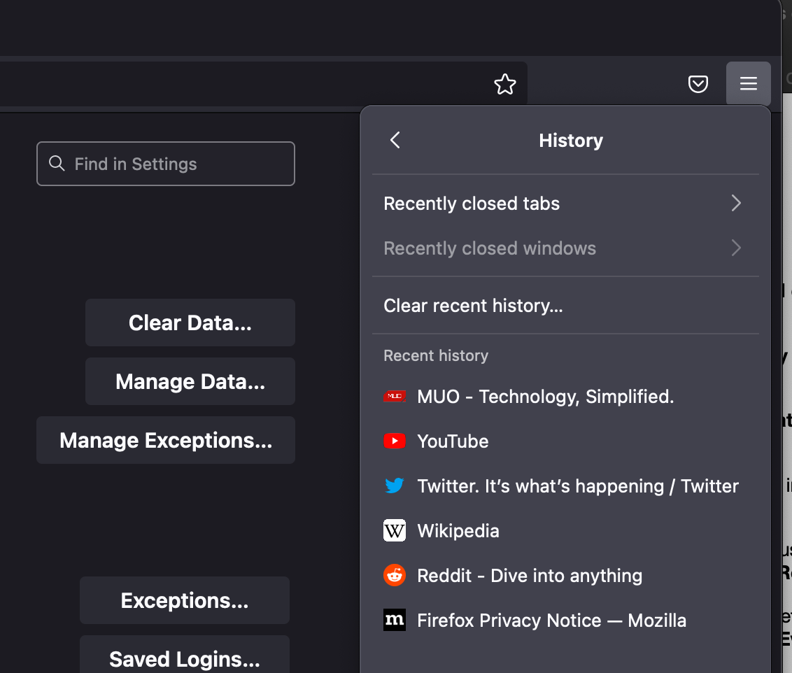 Firefox has another quick cache and cookie clearout method if you want to use that instead. Open the three line menu button and click on History. In the menu that appears, select Clear Recent History. A Clear History window will pop up.