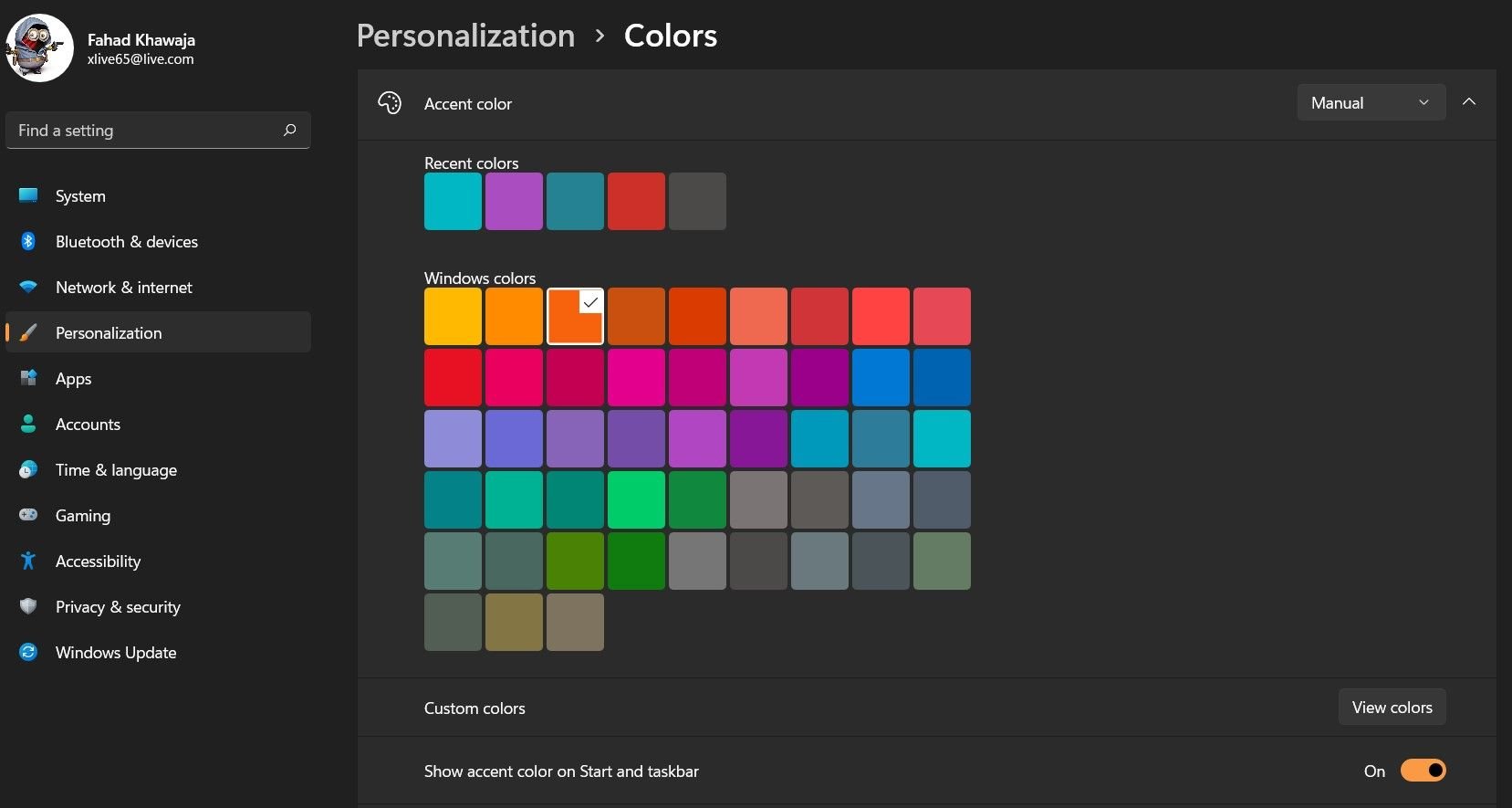 - Under Accent color, choose the color you want for the taskbar and Start menu.