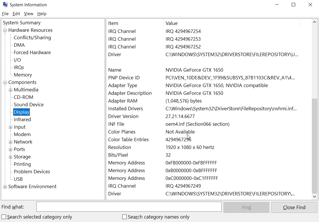 - In the System Information window, expand the Display section.