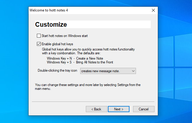 It also has global hotkeys that allow you to start a note from anywhere, and it allows you to customize what double-clicking the icon in the notification tray will do. That's a small tweak, but super helpful.