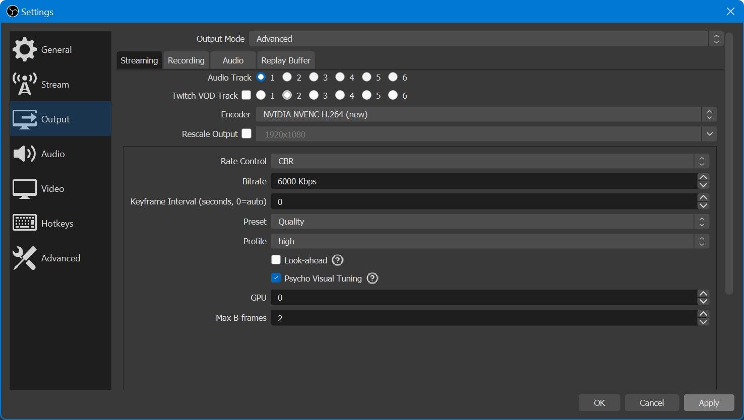 - For Rate Control, use CBR. Set the Bitrate to 6000 Kbps if you stream on Twitch or 10000 Kbps if you stream on YouTube.